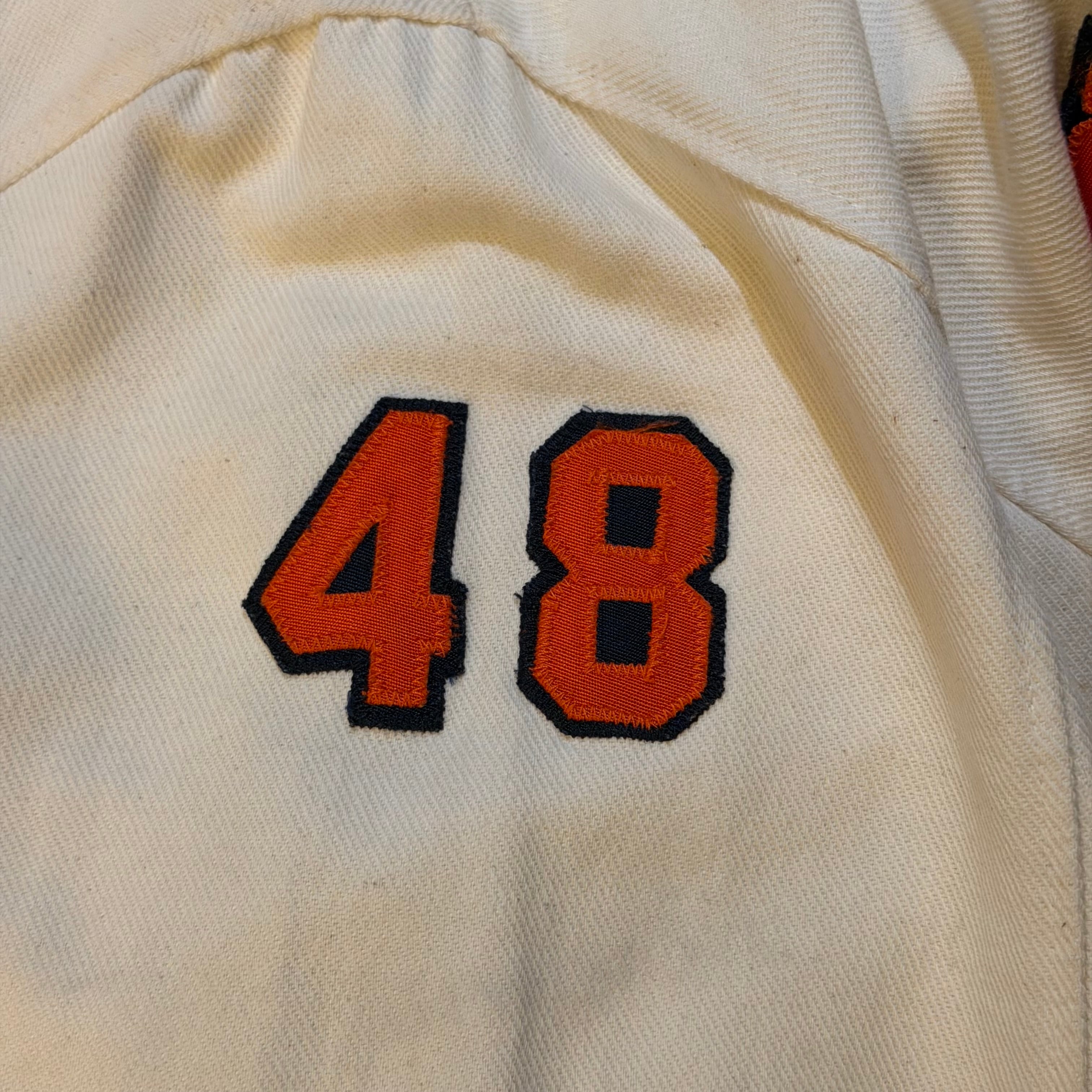 白のコットン生地にオールドイングリッシュやアーチロゴのオレンジワッペンが映えますね