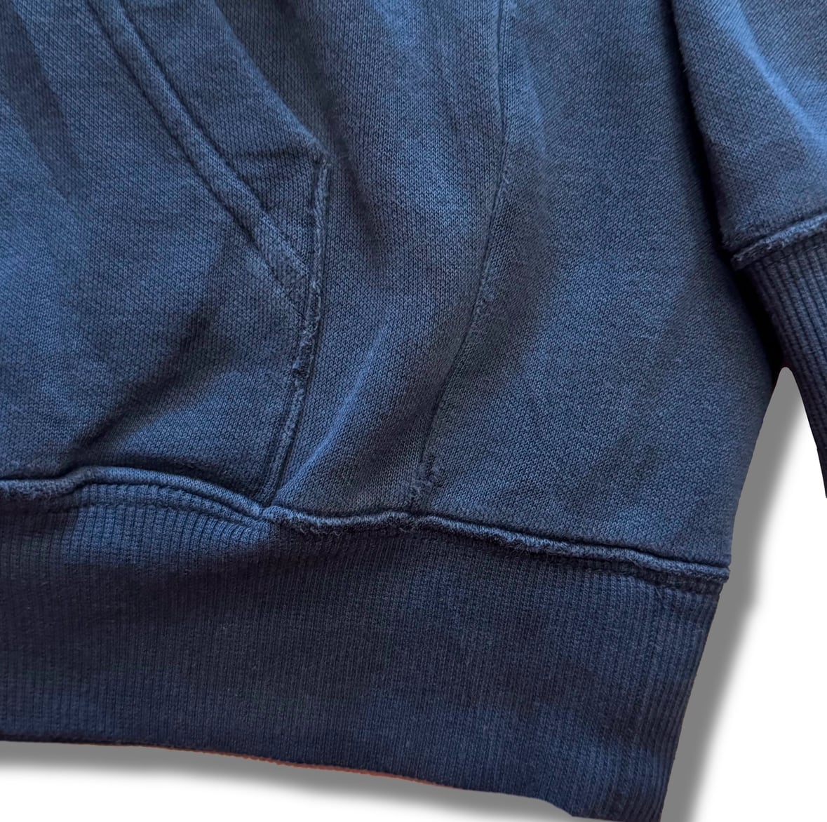 ネイビーのフェードしたボディの質感や雰囲気も良く、裏起毛にはなっているものの生地感もそこまで厚すぎないからこその使いやすさもしっかりと!